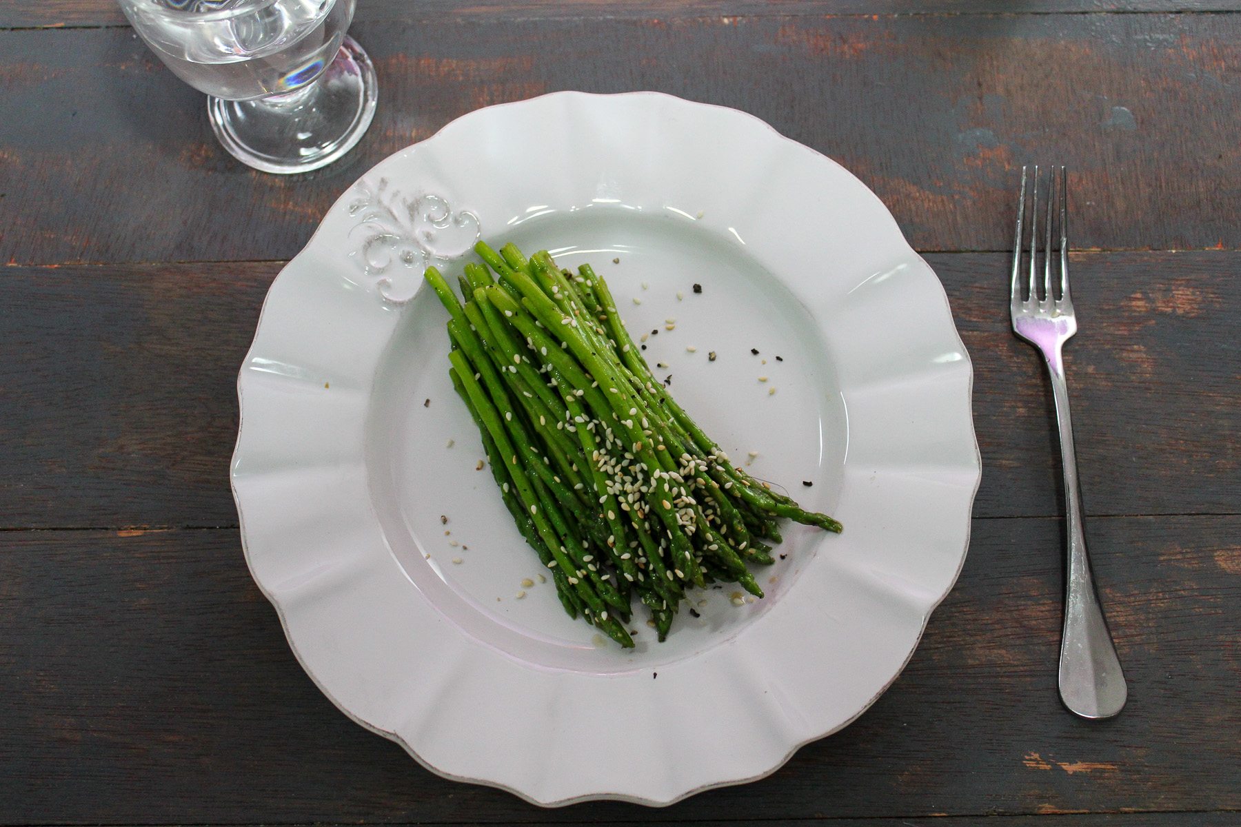 These 5 ingredients Sesame Asparagus makes a great side dish to almost any meal! I served mine with chunks of grilled chicken that was marinated with sesame oil, soy sauce, garlic, ginger and black pepper!