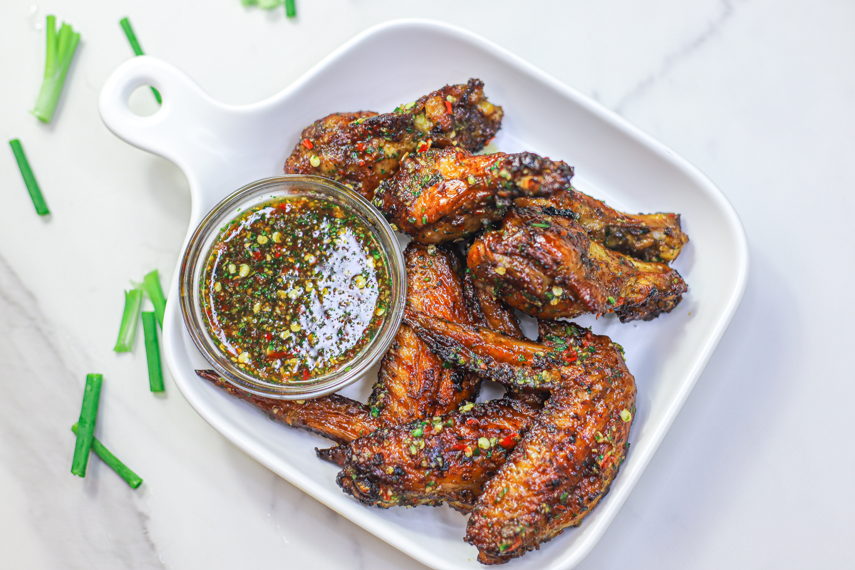 The recipe is fairly simple with basic ingredients like fish sauce, soy, chilies..etc. You marinate the wings for at least two hours or overnight, grilling them in the air fryer. You can use the oven or over an open fire. You make a simple sauce that tastes authentically Thai. The sauce is a MUST and it is really what makes the chicken wings from an eight to a ten. You are gonna be begging for more and most probably want to dip anything and everything into that sauce.