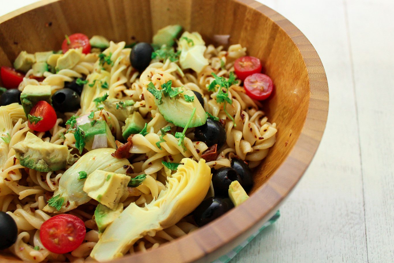 So while ransacking the FULL pantry, I then saw a can of artichokes and I was reminded of the salad pasta that Sunny Anderson made. She uses artichokes in her salad. I obviously had to jazz things up. Instead of just tossing everything in a bowl, I lightly saute the aromatics (Read: onion + garlic) I also added some avocados cubes for that extra richness. Avocado and artichoke pasta salad