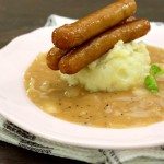 - Spoon the mash onto 5 dinner plates, place two 2 – 3 sausages either on the top or at the side of the mash and pour the hot onion gravy over.