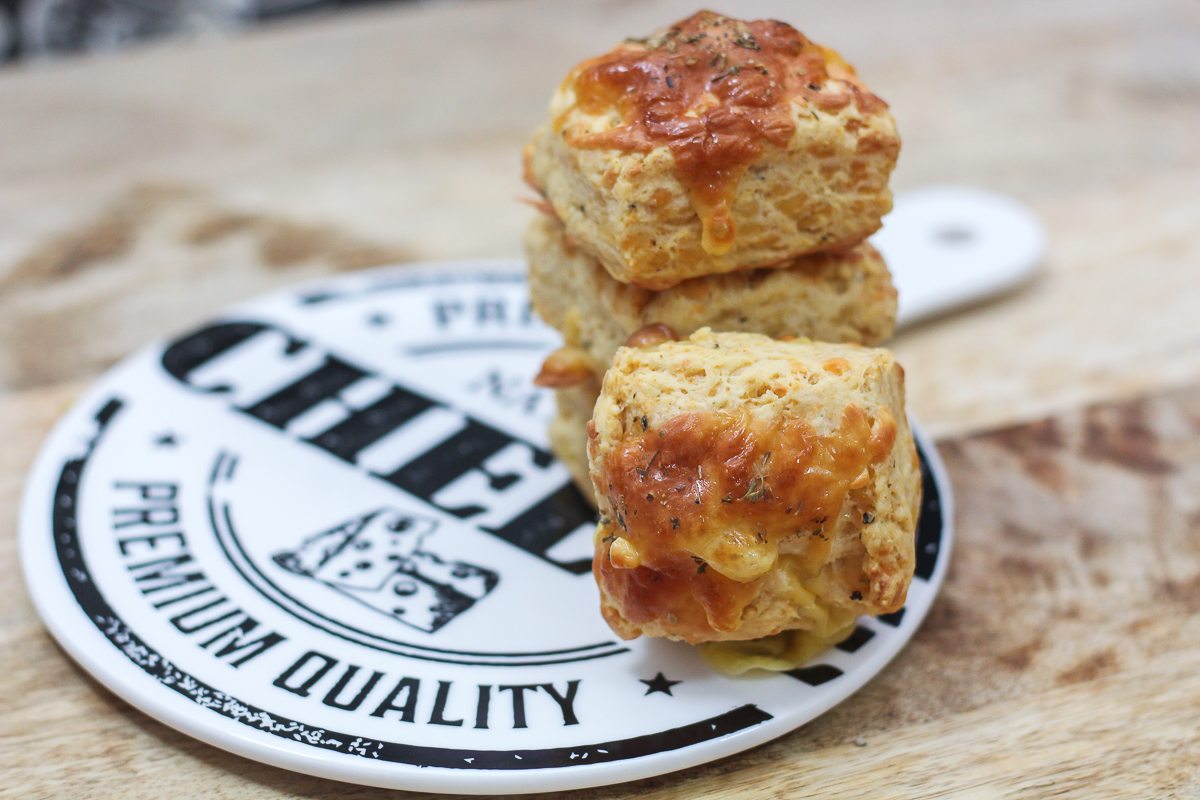 - Lightly flour a surface and roll out the dough to approximately 2cm thick. Cut out the scones with a medium cutter and then place on a baking tray. Glaze the tops with the cream/milk and sprinkle a little cheese and mixed dried herbs on the top of each scone before putting in the oven for about 12-16 minutes.