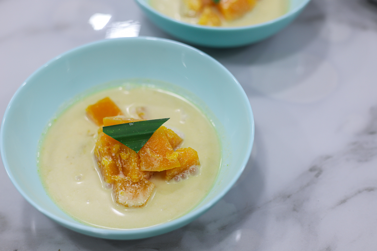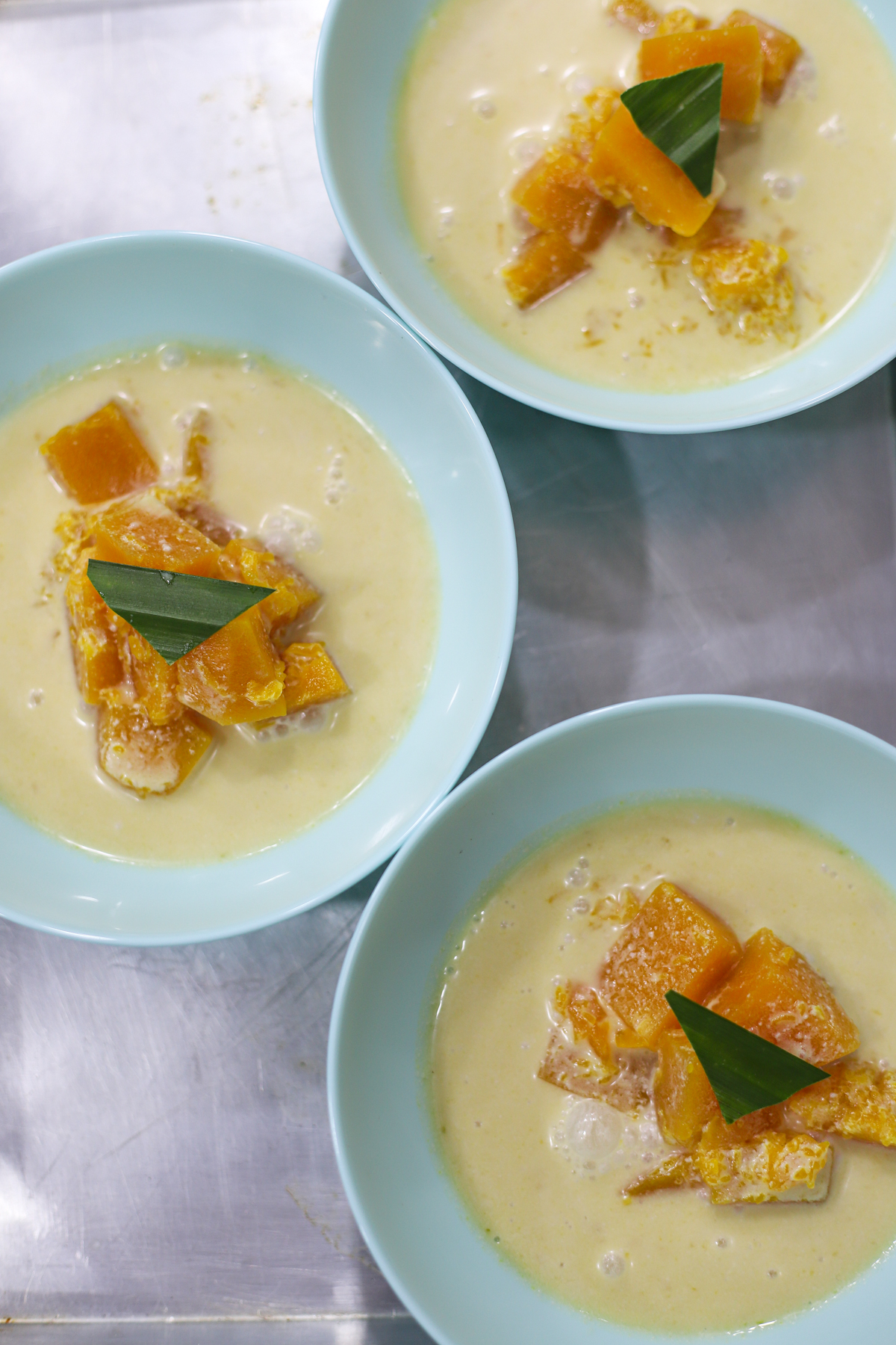 Simply begin with cutting some pumpkin into cubes and boiling it in water till fork tender. I used palm sugar (Gula Melaka) as the sweetener. It has this smoky caramel, a toffee-ish taste which is perfect for Asian desserts. I am sure you can easily get it in Asian stores. If you are not able to get your hands on palm sugar, you can just use coconut sugar which I noticed has become quite a craze. You can also use a few screwpine/pandan leaves for added fragrance but this is again, optional.