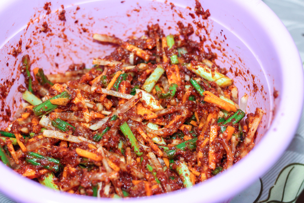 Okay, let’s start with how the traditional kimchi involves you cooking some Thai rice flour over the stove to create a paste. This ensures that the seasoning and spices “sticks” better to the cabbage. This recipe uses blended rice instead. Smart eh? Honestly I wished I was the brainchild behind this idea, but nah. It wasn’t me.