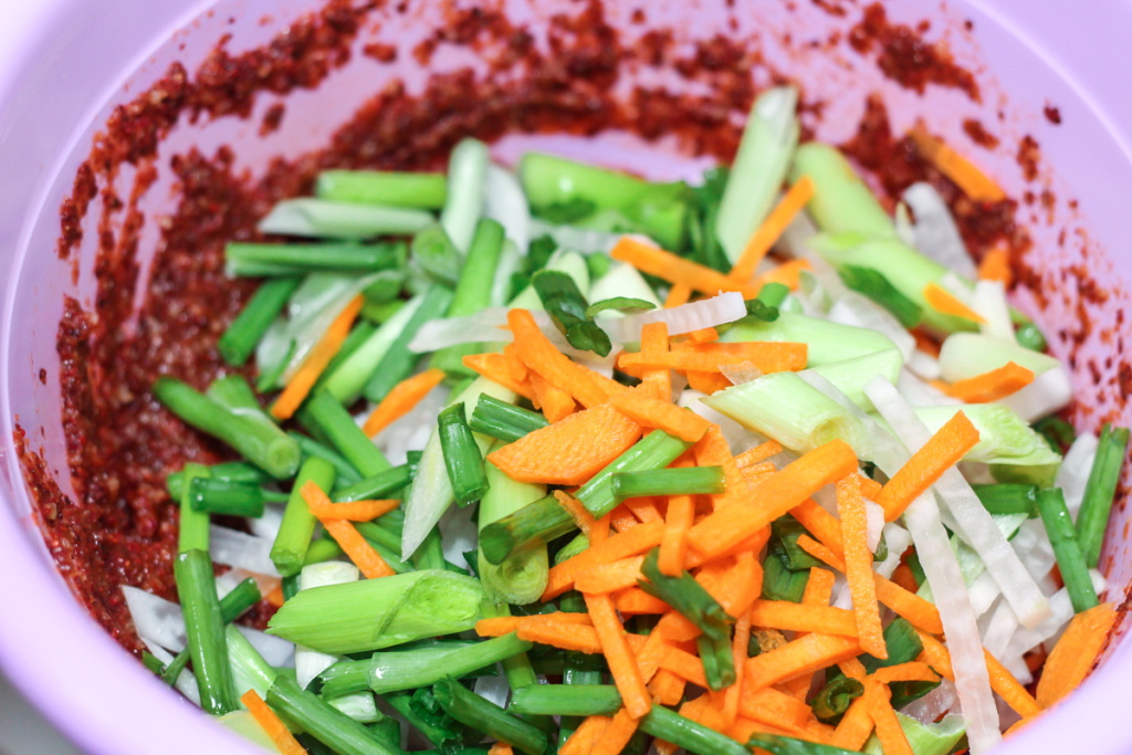 - Add the carrots, radishes and scallions and mix until well incorporated.
