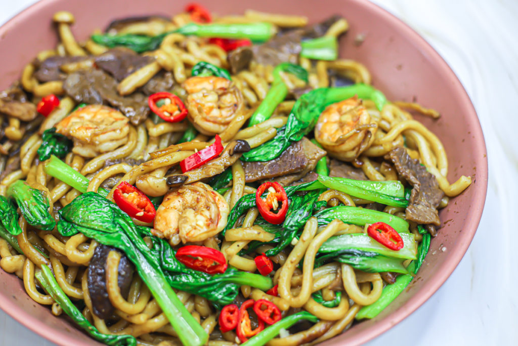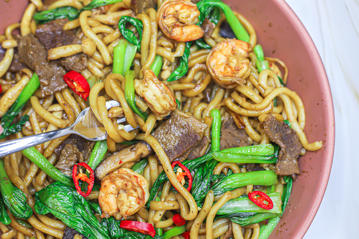 This udon stir-fry is fuss-free, so If you have 20 minutes at your disposal, you are in for a treat. I used beef and prawns for this recipe but feel free to use chicken or any other protein you prefer. You can make it completely vegetarian too and if you love mushrooms, please add that to that udon. It adds such a lovely umami flavor to the dish. Don’t you love versatile recipes like this?