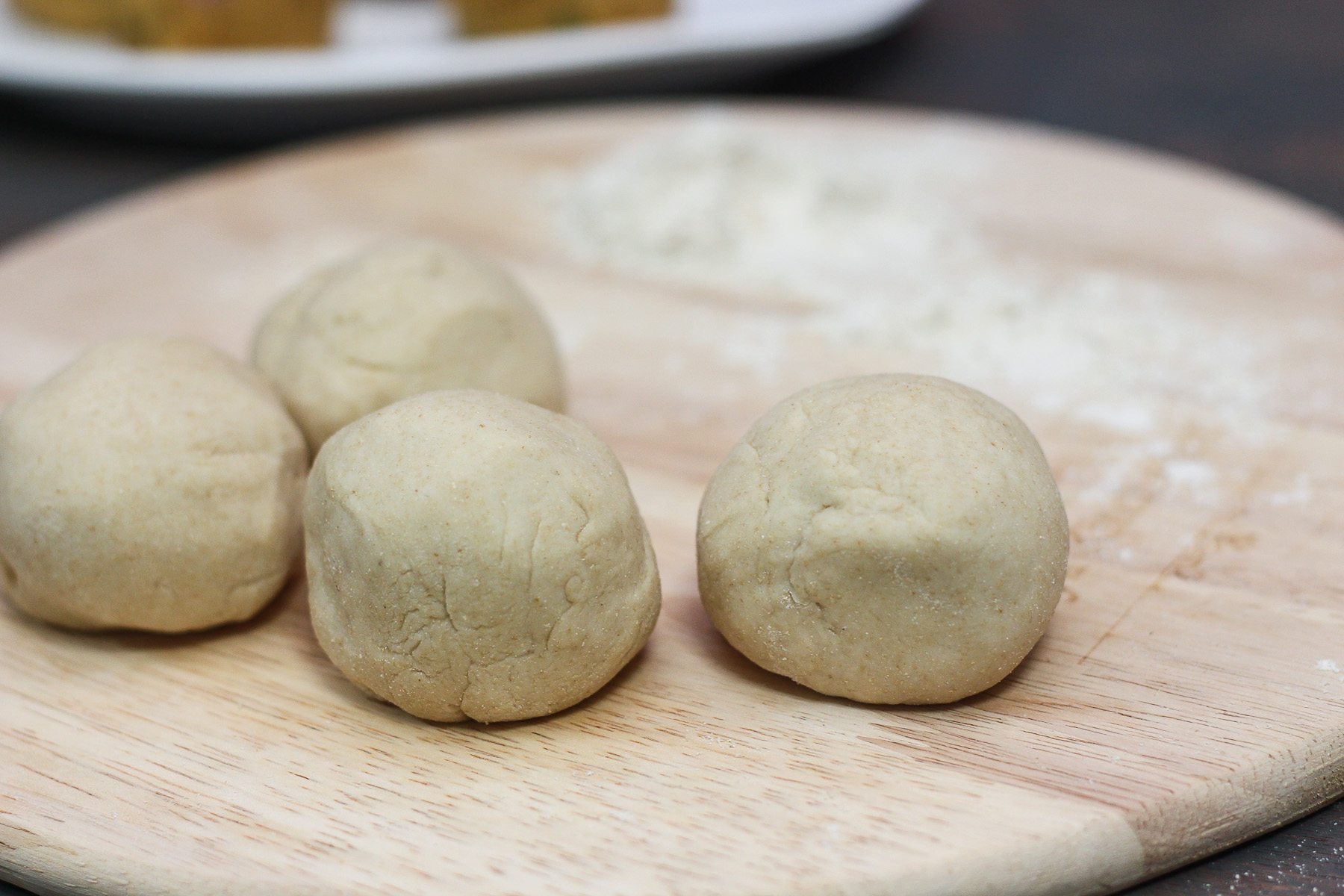 Along a well-dusted board, place a golf ball size dough and roll it into a circle of approximately 5 – 6 inches diameter.