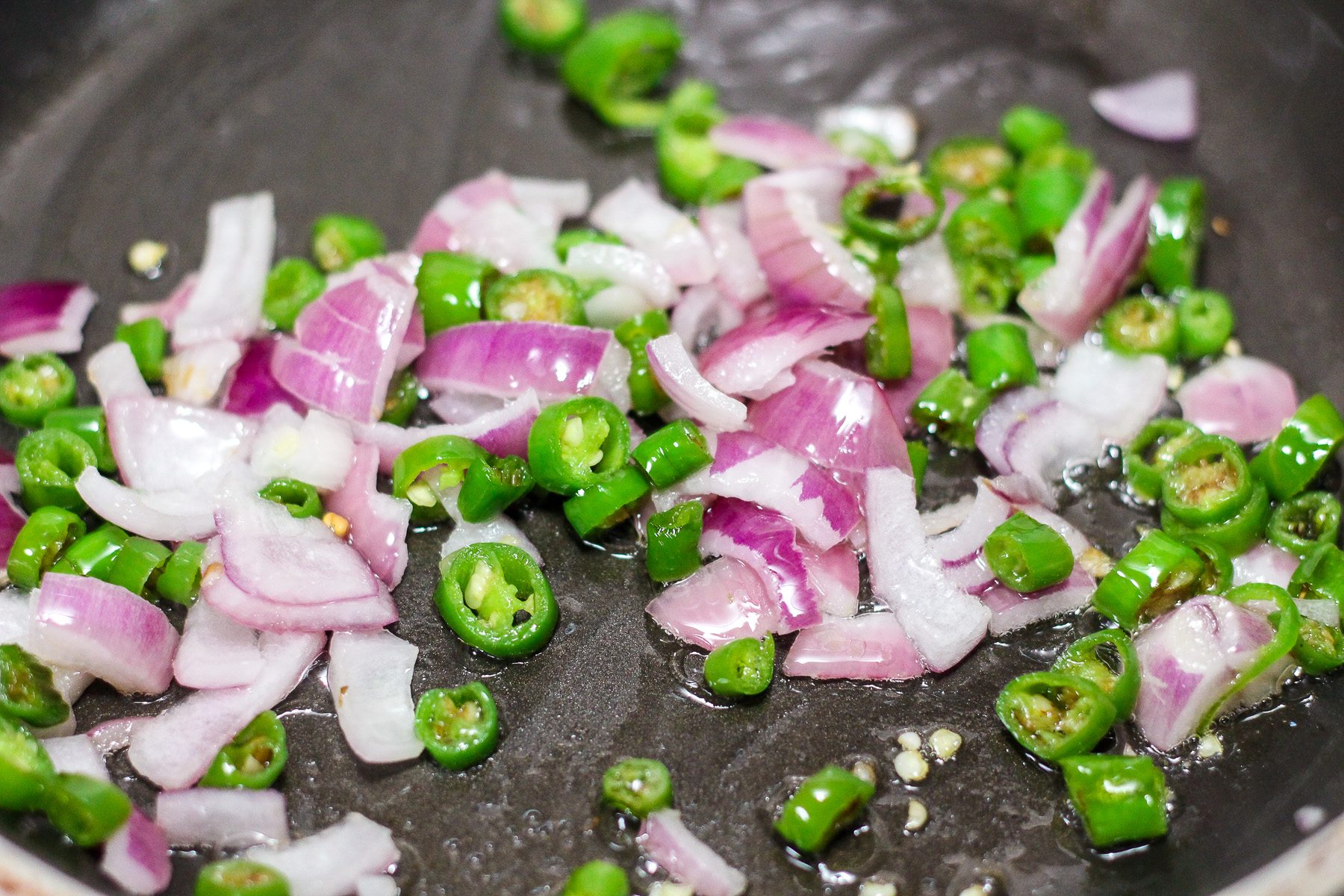 1. In a frying pan, heat 1 tablespoon of oil and saute green chili and onion for 3-5 minutes.