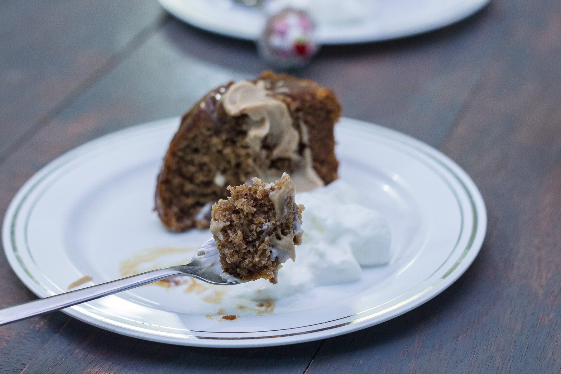 2. Drizzle 1/2 cup of the warm sauce over the cake. Reserve the rest of the sauce to top the cake with when ready to serve.Pour half of the sauce over the cake.
