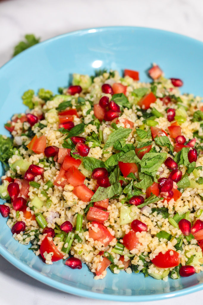 If you are trying to eat healthier but running out of options, this Tabbouleh recipe is definitely for you. It also makes a good meal prep. Use it in wraps or use it as a base for your proteins. The options are limitless. I added some garlic, cilantro, pomegranate seeds and cucumber to this Tabbouleh recipe which is not a norm. There are other recipes adding some spices to it too; like a pinch of cumin and coriander. Feel free to make it your own.